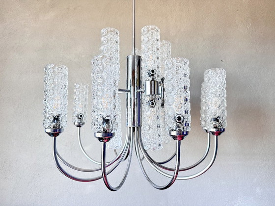 Base cromata con bracci curvi e 20 paralumi in vetro scolpito.