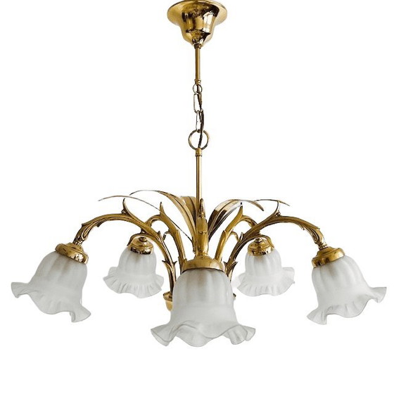 Questo lampadario dorato ha una struttura in ottone e presenta sei splendide foglie di palma dorate verticali. Questo lampadario vintage è stato accuratamente lucidato e brilla come nuovo. Il lampadario dorato vintage ha un diametro di circa 66 cm ed è alto circa 57 cm.