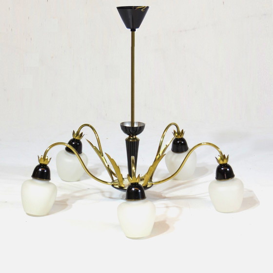 Lampadario vintage in ottone e vetro opalino, anni '60. Dotato di cinque luci, il lampadario è in buone condizioni e presenta solo minimi segni d'uso che si addicono alla sua età. Le dimensioni sono le seguenti: