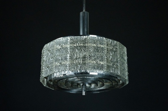 Questo splendido lampadario da soffitto è probabilmente una produzione Kinkeldey degli anni '60, con una struttura geometrica realizzata in metallo cromato e pannelli in cristallo sfaccettato di alta qualità. L'opera combina l'eleganza moderna di metà secolo con una straordinaria maestria artigianale, mettendo in mostra intricate lavorazioni in vetro disposte in una disposizione circolare e un supporto a soffitto in stile modernista con asta cromata. Il suo design distintivo, caratterizzato da vetri tagliati che riflettono la luce in motivi abbaglianti, lo rende un'aggiunta di grande impatto a qualsiasi interno classico o contemporaneo. Perfetto per collezionisti e amanti dell'iconico design di illuminazione europeo dell'era spaziale. Completamente funzionante con cablaggio standard UE, facilmente adattabile agli standard statunitensi su richiesta.