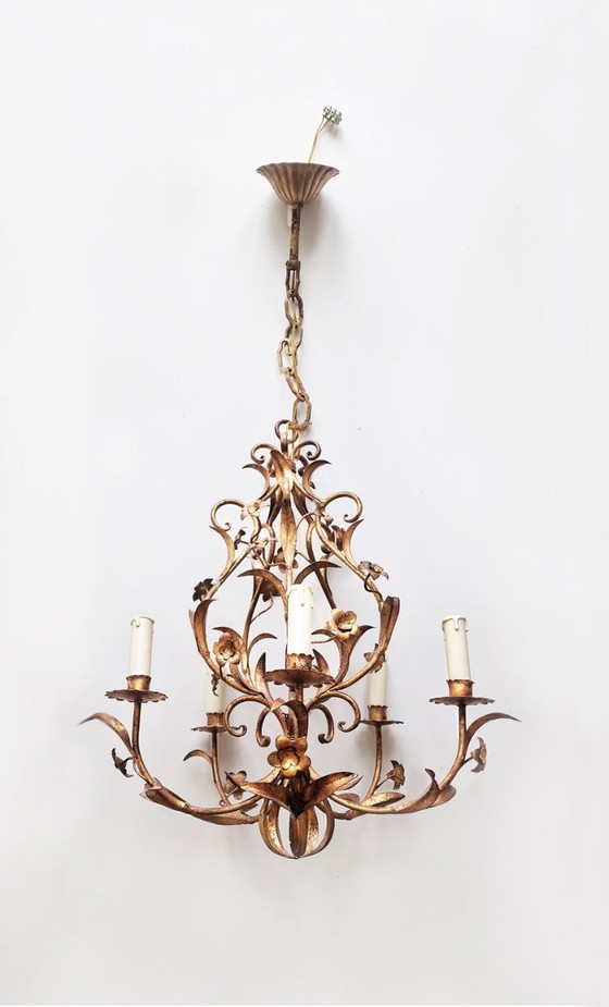 Un raro pezzo vintage artigianale italiano, in stile fiorentino in ferro battuto. Questo imponente lampadario faceva parte dell'arredamento di un'ambasciata diplomatica e unisce l'eleganza classica all'artigianato mediterraneo. Realizzato in Italia, probabilmente risalente agli anni '60-'80, in stile fiorentino/Luci Ferro Battuto. Molto ben conservato, con una patina autentica. Ferro battuto, verniciato oro.