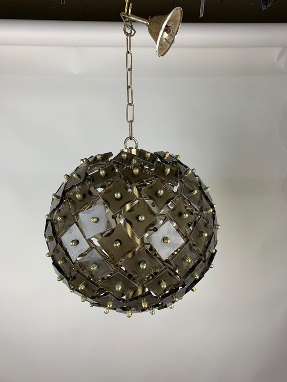 Si tratta di uno splendido lampadario Zero Quattro Sputnik degli anni '70, caratterizzato da un design sferico unico. Il lampadario è realizzato in metallo e vetro, con una sorprendente combinazione di toni oro e argento. L'intricato motivo e gli elementi in vetro trasparente creano un'accattivante esposizione di luce, rendendolo un perfetto centrotavola per qualsiasi ambiente. Nonostante l'età, il lampadario è in ottime condizioni, con solo un po' di ruggine visibile su alcune parti metalliche, che ne accresce il fascino vintage.