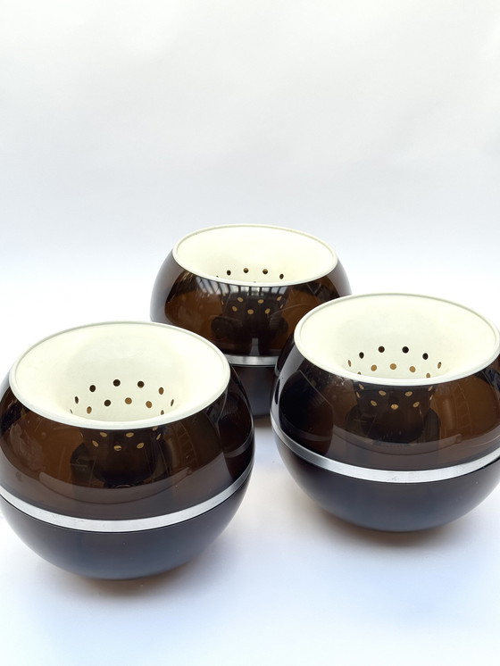 IN VENDITA: Set di 3 lampade a sospensione originali Dijkstra Globe in marrone. Iconico design Space Age degli anni '60-'70. Struttura interna in alluminio con globo in plexiglass, che crea una luce ambientale calda e diffusa. In ottime condizioni vintage; due lampade sono molto pulite, una presenta una piccola crepa nel plexiglass (vedi foto), che non ne compromette l'uso. Un raro set coordinato, ideale per interni in stile Mid-Century Modern, MCM, retrò e Space Age.