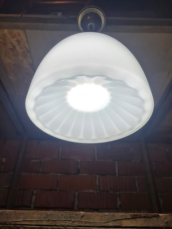 Questa rara lampada a sospensione industriale è stata progettata dal designer ceco Miloslav Prokop e prodotta in Cecoslovacchia negli anni Trenta. Il pezzo presenta un paralume in vetro opalino pressato con sottili dettagli a coste sul lato inferiore, che creano una morbida diffusione della luce. L'apparecchio è sospeso da una montatura in ottone, tipica dell'illuminazione industriale del primo Novecento.