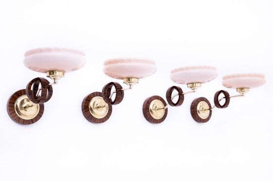 Lampade da parete dalla forma geometrica caratteristica dello stile Art Déco. Lampade eleganti e uniche che completano perfettamente l'aspetto degli interni contemporanei. Una bella combinazione di legno di noce espressivo, metallo dorato e paralumi in vetro rosa cipria.
