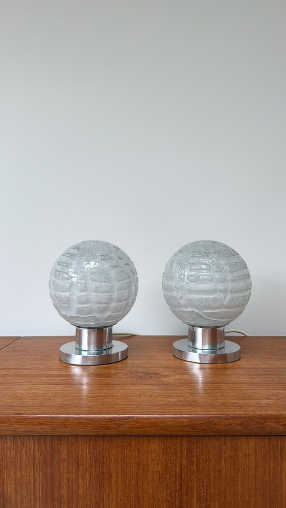 Lampade da tavolo Space Age di Doria Leuchten, prezzo fisso. Dimensioni: 14Ø x 20H cm. Le lampade da tavolo sono realizzate in cromo e vetro, circa 1960-1970. Attacco E14. Le lampade sono in buone condizioni vintage con minimi segni di usura coerenti con l'età.