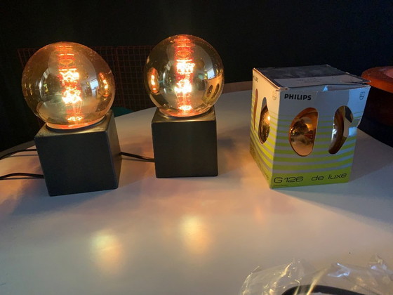 lampade da tavolo vintage Philips a cubo (2) e lampada extra