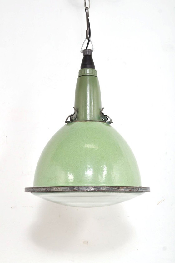 Bellissime lampade smaltate degli anni '50 con piano in vetro convesso. Modello e colore fantastici!