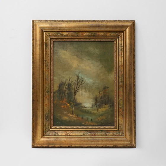 This atmospheric mid-century painting by Belgian artist Degehryver captures a serene, classically rendered landscape, balancing mood, depth, and refined technique. Painted circa 1950, the work features a soft interplay of muted greens, warm earth tones, and delicate highlights, creating a tranquil yet evocative scene of trees, open fields, and shifting skies.