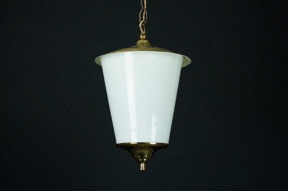 Lanterna a sospensione Mid-Century in ottone e vetro lattimo di Murano, Italia, anni '50.