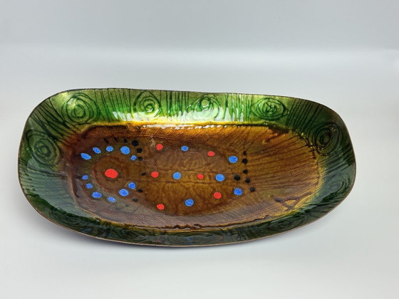 Exceptional large rectangular enamelled copper tray by Studio Laurana,, Pesaro Italy, 1960s. Including signature and brand label. The slightly concave form with softly rounded corners is finished in transparent enamel layers in warm amber and deep green tones, enriched with vivid hand-applied red and blue dot accents. Subtly visible in the base is an abstract fish-like motif, emerging through the layered enamel and engraved copper texture. The surface shows fine linear tooling marks beneath the enamel, giving depth and movement to the composition—typical of Studio Laurana’s expressive mid-century work, where craft, colour and symbolism intersect. Produced in Italy by Studio Laurana, known for high-quality mid-century enamel work on copper. Their pieces are characterised by transparent colour fields, engraved substrates, and playful accent colours—often incorporating abstract natural themes such as fish and organic forms. Dimensions: approx. Height 8,5 Width 43 Depth 27 cm