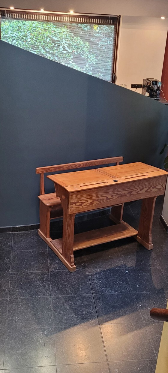 - Scrivania scolastica antica, completamente restaurata, realizzata in legno massello, offre resistenza e una lunga durata.