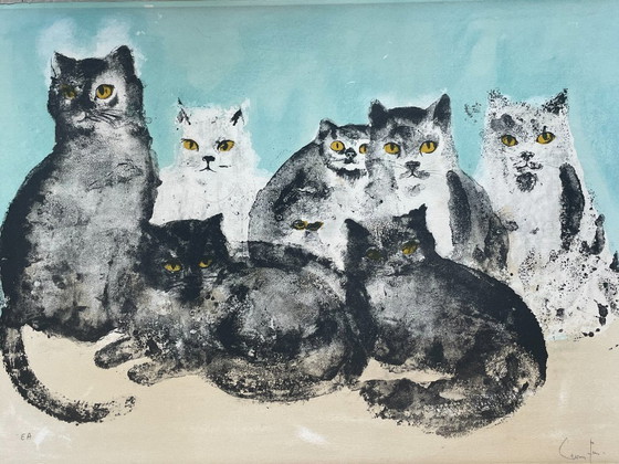 Rara stampa firmata dall'artista surrealista Leonor Fini, sempre più apprezzata dal movimento di riscoperta dell'arte femminile. Leonor Fini adorava i gatti e ha dedicato loro diverse opere, tra cui questa. Questa rara litografia originale è una prova d'artista in ottime condizioni. Bella armonia di colori. Dimensioni: 74 x 53 cm