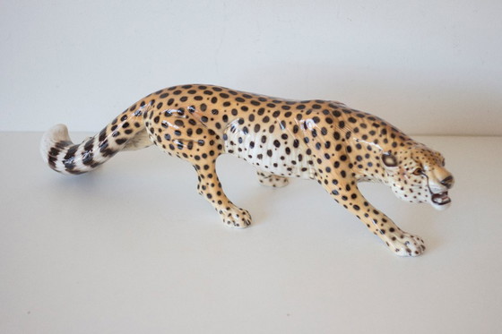 Raffinato leopardo in ceramica firmato dalla rinomata casa italiana Ronzan Ceramiche, circa anni Settanta. Un grazioso modello che si aggira, interamente dipinto a mano e rifinito con uno smalto lucido. Si tratta di un esemplare numerato e marcato (1530/1 - Made in Italy - Ronzan), appartenente a una serie molto amata di figure di animali di qualità museale.