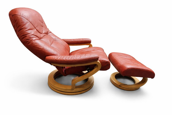 Scopri il fascino del design vintage con questa splendida poltrona girevole in pelle e il poggiapiedi abbinato. Questo set combina perfettamente comfort e stile, invitandoti a rilassarti nel tuo soggiorno.