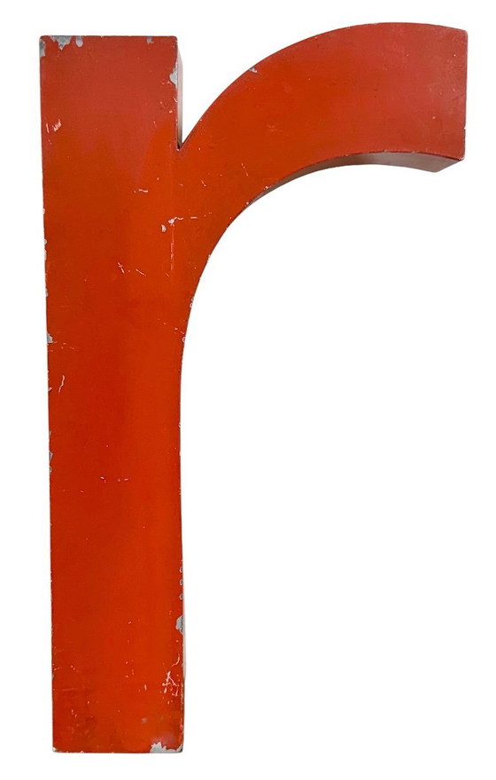 Questa lettera "r" in stile industriale vintage è stata realizzata negli anni '70 in Italia e proviene da un vecchio striscione pubblicitario. Il peso della lettera è di 0,7 kg.