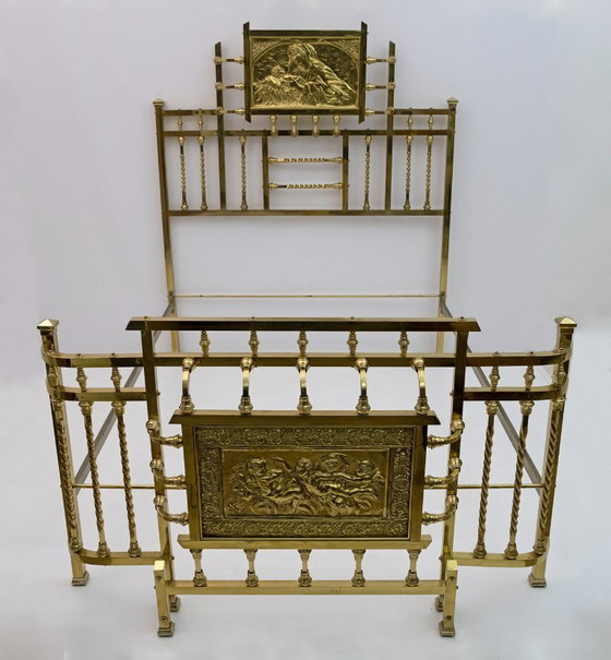 Grande letto matrimoniale italiano dei primi del Novecento. Oggetto di qualità favolosa e decorazione in ottone dorato. Letto decorato con placche raffiguranti personaggi femminili e putti neoclassici, nello stile dell'Art Nouveau francese o del Liberty italiano (vedi foto). Oggetto di grande carattere, per antiquari e arredatori. Letto che può ospitare una struttura interna con le seguenti misure massime L 160 x P 194 cm. In buone condizioni con alcuni segni di usura.