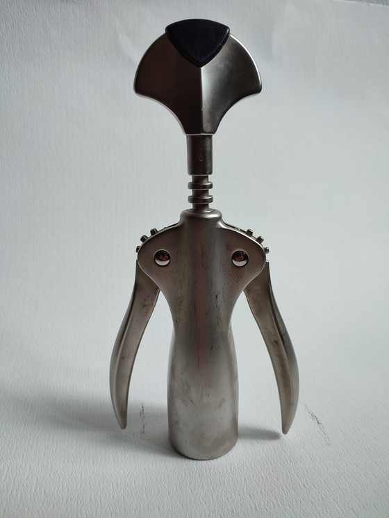 Realizzato in acciaio inossidabile, finitura opaca. È un cosiddetto cavatappi a leva. Presenta qualche segno di usura, ma è ancora molto decorativo e utilizzabile. Qualità robusta.
