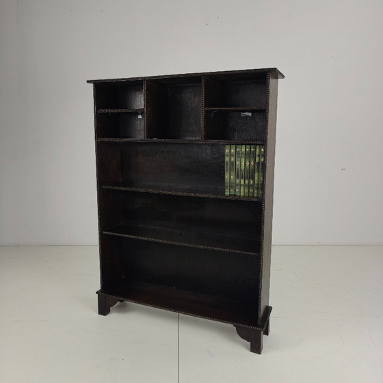 Affascinante libreria a giorno del XX secolo con perline decorative lungo i lati e i ripiani. I ripiani hanno altezze diverse, rendendola ideale per libri o oggetti da esposizione. Presenta evidenti segni di usura coerenti con la sua età (vedi foto), che ne esaltano il carattere.