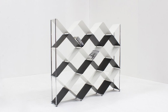 Libreria vintage italiana in acciaio cromato. Presenta una struttura in acciaio cromato e ripiani in acciaio verniciato bianco e nero. Può essere posizionata anche al centro della casa come divisorio. Lievi segni di usura coerenti con l'età e l'uso di questo prodotto di seconda mano.