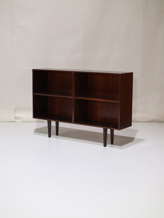 Bella libreria bassa proveniente dalla Danimarca, anni '60. Questa libreria aperta è realizzata in legno di palissandro. I due ripiani sono regolabili in altezza.