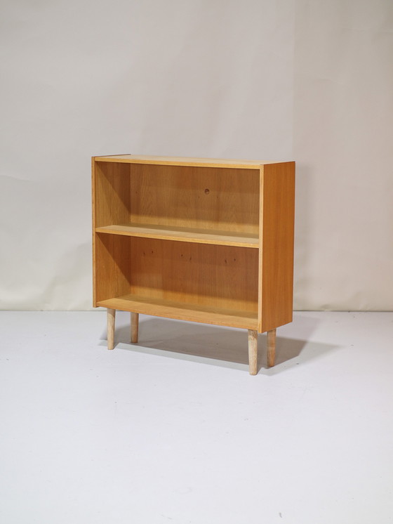 Una splendida piccola libreria danese degli anni '60. Questo mobile vintage minimalista è realizzato in rovere chiaro e ha un ripiano fisso. In ottime condizioni, con minimi segni di usura. L88,5 x P27 x A88 cm.