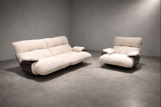 Ligne Roset Marsala Tweezitsbank, disegnata da Michel Ducaroy (1970-1990), ristrutturata in tessuto bouclé, un perfetto contrasto di materiali con l'Altuglass della scocca