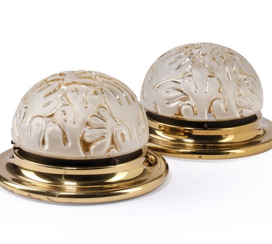 Illumina il tuo spazio con un tocco di eleganza vintage grazie a queste splendide plafoniere Limburg degli anni '70. Queste lampade presentano cupole in vetro dal design elaborato che emanano una luce calda e invitante, perfette per creare un'atmosfera suggestiva in qualsiasi stanza. La base in metallo dorato si abbina perfettamente al vetro color crema, aggiungendo un tocco lussuoso al tuo arredamento.