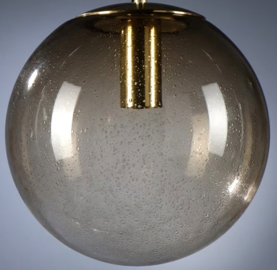 Questa è una splendida lampada a sospensione Limburg degli anni '70, caratterizzata da un bellissimo globo di vetro trasparente con una sottile texture a bolle. La lampada è elegantemente completata da accessori in ottone che aggiungono un tocco di fascino vintage. Il suo design sferico e i materiali di alta qualità la rendono un'aggiunta perfetta a qualsiasi interno retrò o moderno. La lampada è in ottime condizioni e mostra il design senza tempo e la maestria dell'epoca.