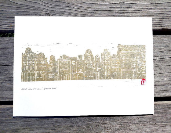 Questa linoleografia di Amsterdam cattura la tranquilla poesia, stampata a mano in oro. Le linee sottili e il contrasto grafico evocano il fascino di questa città iconica in uno stile minimalista e senza tempo.