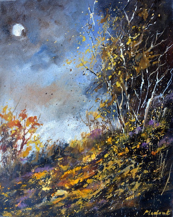 Quest'opera d'arte cattura magistralmente una scena autunnale al crepuscolo. La luna, velata dalle nuvole, illumina sottilmente il paesaggio, creando un'atmosfera mistica. A destra, esili alberi sfoggiano le loro ultime chiome dorate, mentre i bordi del dipinto rivelano una profusione di colori autunnali - arancio, giallo e viola - che evocano un tappeto di foglie. La tecnica artistica, caratterizzata da macchie vivaci e pennellate dinamiche, conferisce alla tela una notevole vivacità. Il contrasto tra l'oscurità del cielo e la luminosità scintillante della vegetazione accentua la profondità della composizione. L'atmosfera complessiva è al tempo stesso rasserenante e malinconica, evocando il passaggio tra le stagioni. Questo dipinto, con la sua maestria di sfumature ed espressività, immortala la fragile bellezza della natura nel suo flusso.