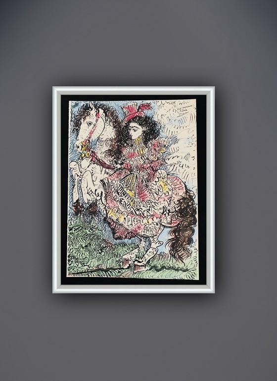 Litografia originale a colori di Pablo Picasso, Jacqueline a cavallo.