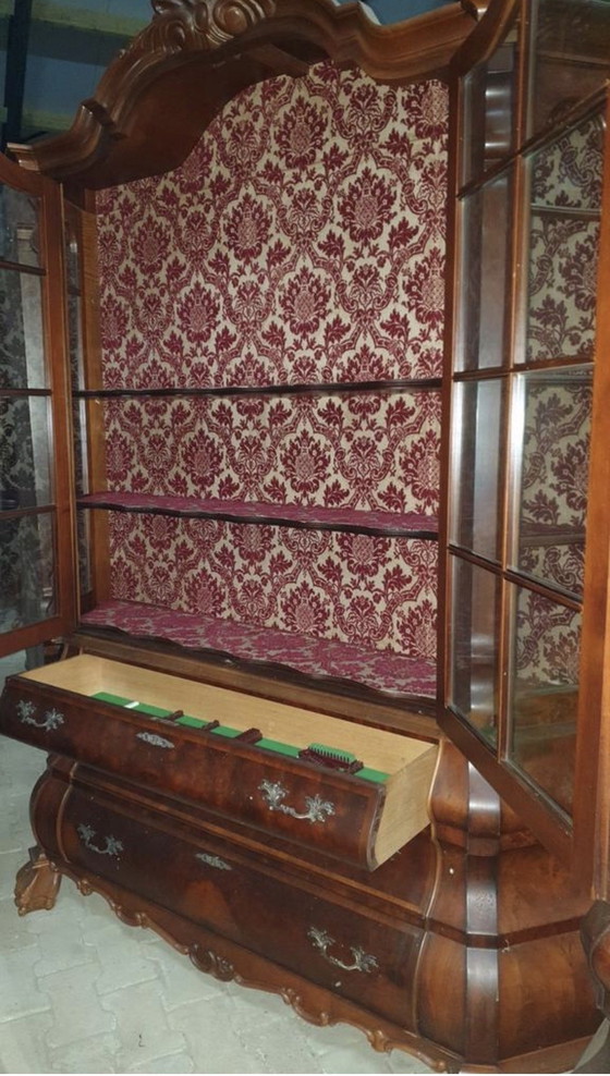 Questa squisita credenza barocca Lodewijk è una testimonianza della grandiosità del design barocco. La sua ricca finitura in legno marrone è completata da intricati intagli ed eleganti ante in vetro, rendendola un'aggiunta sorprendente a qualsiasi interno sofisticato. L'interno è decorato con un lussuoso motivo damascato rosso, che aggiunge un tocco di opulenza alla sua già maestosa presenza.