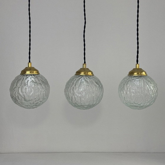 Set di tre lampade a sospensione rotonde in vetro texturizzato. Bellissimo effetto luminoso. Rosone in metallo.
