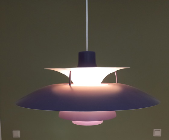 La lampada a sospensione PH5 Lila di Louis Poulsen è un esempio iconico del design moderno di metà secolo. È una delle prime versioni degli anni '60/'70, completa di rivetti che le conferiscono un autentico carattere vintage. La lampada è in splendide condizioni ed è perfetta per gli amanti del design vintage. Il design è sia funzionale che estetico, con una splendida combinazione di colori viola e bianco che crea un look elegante.