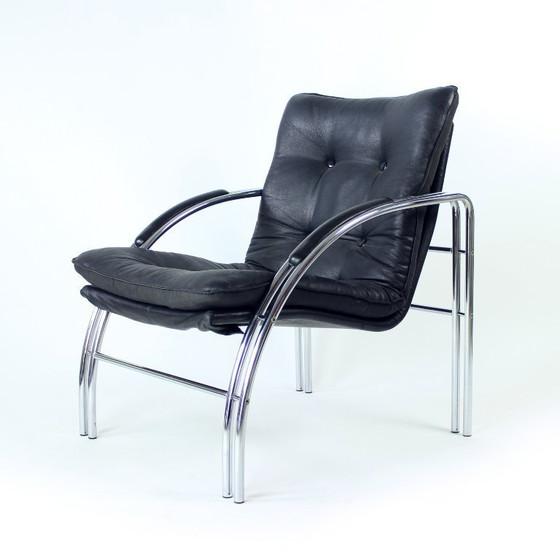 Bella ed elegante poltrona da salotto disegnata da Viliam Chlebo e prodotta da Kodreta in Cecoslovacchia negli anni Ottanta. L'elegante struttura è realizzata con tubi cromati piegati e sostiene una base di seduta in lino nero con cuscino in ecopelle. La sedia è in ottime condizioni originali. Il cromo rimane brillante e integro, mentre la seduta mostra solo lievi segni di patina dovuta all'età. Un pezzo estremamente confortevole che si inserisce senza problemi in ambienti moderni, industriali o di ispirazione vintage.