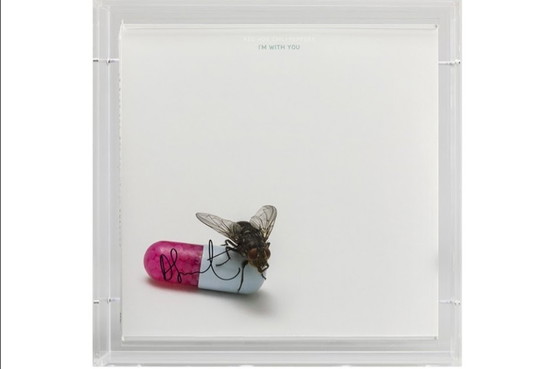 Copertina LP unica e autografata, disegnata da Damien Hirst per l'album dei RHCP "I'm With You" (2011). Opera originale con l'iconico motivo "pillola e mosca", che simboleggia i temi di Hirst sulla vita e la transitorietà.