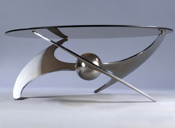 Tavolo da caffè/pranzo vintage Luciano Campanini degli anni Settanta. Presenta un design elegante e moderno con base in metallo e piano in vetro. La struttura unica del tavolo e la sua forma elegante lo rendono un pezzo di spicco per qualsiasi spazio abitativo. La combinazione di materiali in metallo e vetro riflette l'estetica del design degli anni '70, offrendo funzionalità e stile.