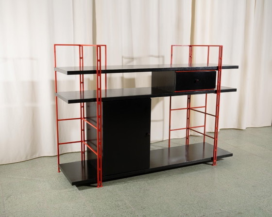 Rarissima credenza postmoderna dell'architetto italiano Luigi Caccia Dominioni. Ha un design modulare e gli elementi possono essere spostati liberamente sul ripiano. Il design risale probabilmente agli anni '80.