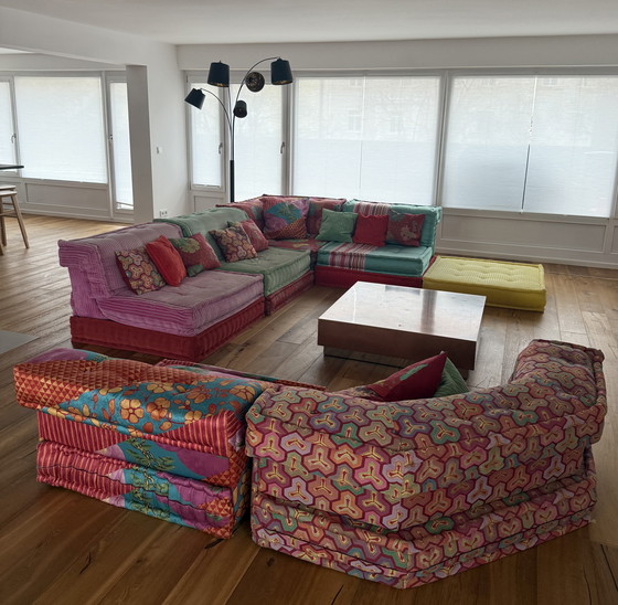 Mah Jong di Roche Bobois. Composizione Kenzo Takada No Gaku - Hiru, design di Hans Hopfer. Acquistato nel 2018, in condizioni da buone a molto buone. 11 pezzi, 6 dei quali con schienale. Il pezzo verde ha uno schienale regolabile. 12 cuscini inclusi (9 piccoli, 2 grandi, 1 cuscino).