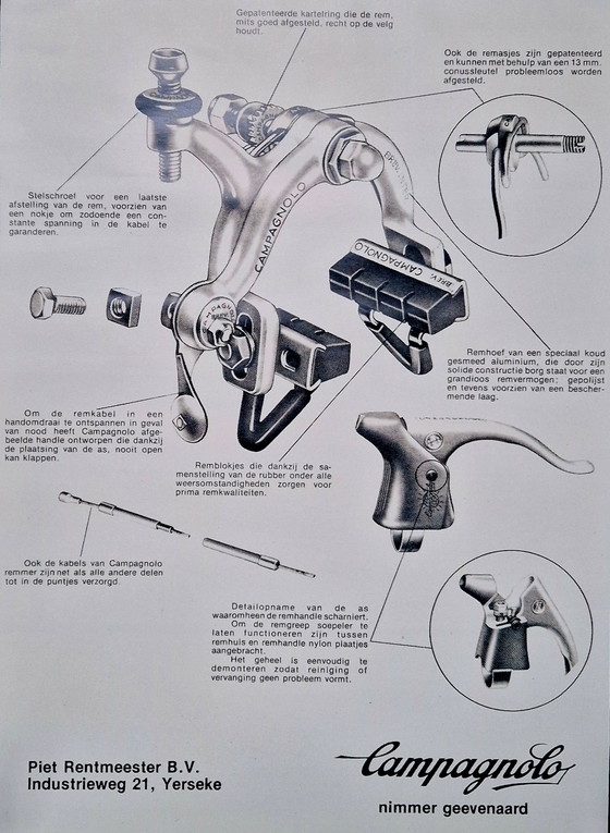 Un bellissimo poster vintage dell'italiana Campagnolo, il rinomato produttore di componenti per biciclette, per il distributore ed ex ciclista Piet Rentmeester di Yerseke, Zelanda. Include una spiegazione dettagliata in olandese sui freni. In buone condizioni. Dimensioni: 70x50 cm.