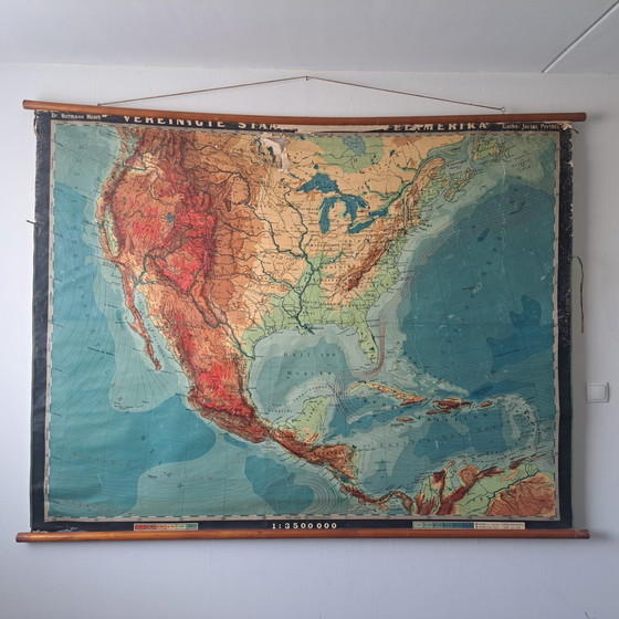 Mappa scolastica; Stati Uniti e America Centrale. Fantastica scoperta: una vecchia mappa scolastica/mappa murale del 1930! Il piccolo danno aggiunge ancora più carattere a questa mappa unica. Gotha: Justus Perthes