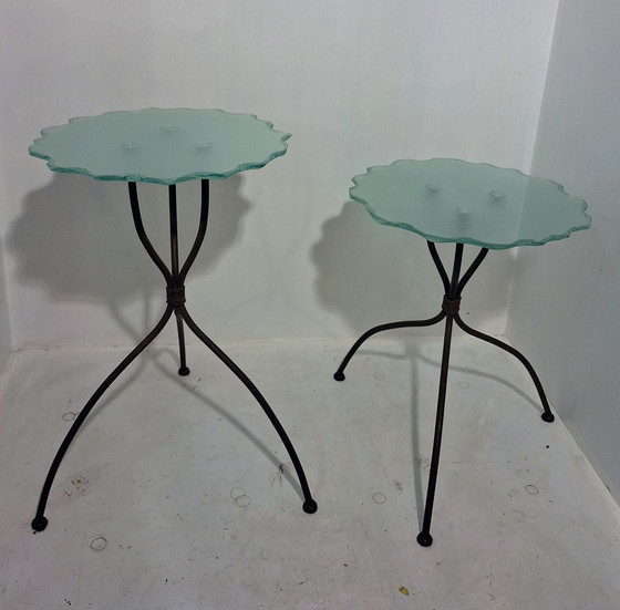 Scopri la raffinata eleganza dei tavolini laterali di Brand Van Egmond, un'aggiunta perfetta a qualsiasi interno moderno. Questi tavolini combinano un piano in vetro satinato con un esclusivo design ondulato e una robusta base in metallo, rendendoli eleganti e funzionali.