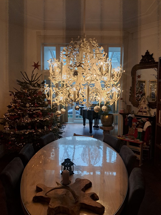 Utilizzando le tecniche più recenti per scolpire sensuali forme floreali da lastre d'acciaio, Flower Power è un meraviglioso incontro tra artigianato e alta tecnologia. Questo si combina con gocce di vetro appositamente progettate che evocano ghiaccioli. Questa lampada misura 120 x 80 cm. Ventidue luci LED dimmerabili sono integrate nel lampadario.