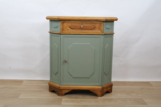 Armadio per marmellate verde salvia con un restyling in stile mobili del 1960 e interni in rovere scuro.
