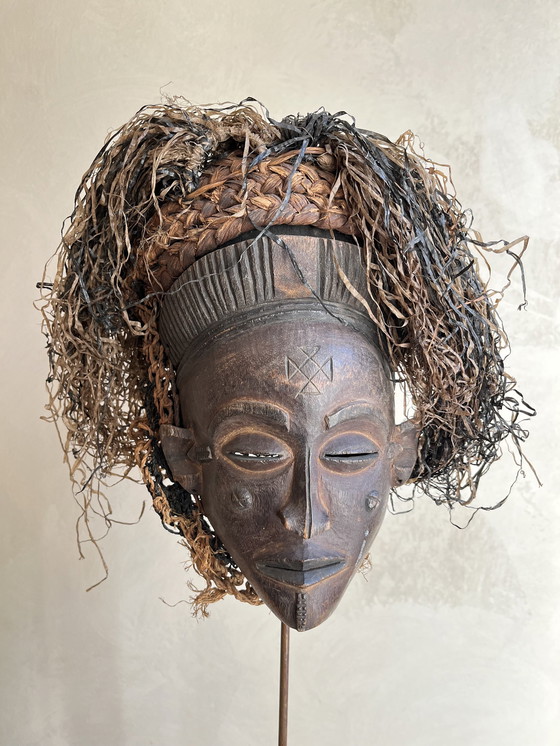 Maschera africana in legno intagliato, rifinita con rafia intrecciata. Presumibilmente una maschera Chokwe.