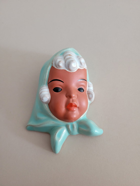 Maschera da muro in terracotta di metà secolo proveniente dalla manifattura Goldscheider nella Germania Ovest. La maschera raffigura una ragazza con un foulard, smaltata in bianco, nero e verde. Sul retro è impresso il marchio di fabbrica.