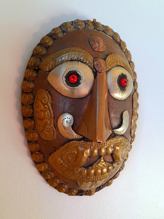 Questa maschera tibetana Kapala è un pezzo decorativo unico, decorato con teschi (2 mancanti). Realizzata in rame e ottone sbalzato, rappresenta la vittoria della luce su tutte le forze demoniache. Ideale per gli amanti della decorazione etnica.