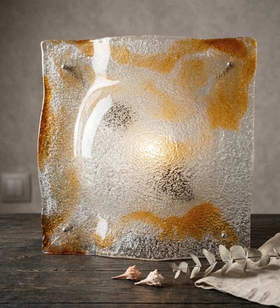 Vetro: Lastra quadrata in massiccio vetro di Murano lavorato a mano con la tecnica "Ghiaccio" (vetro frantumato applicato a caldo). Il vetro sfuma elegantemente dalla trasparenza cristallina dei bordi al cuore centrale color ambra caldo.