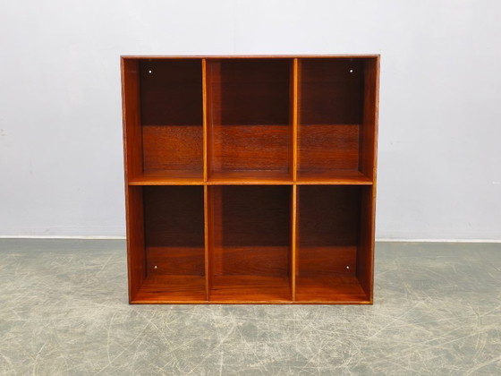 Realizzata in teak massello, questa libreria modulare presenta una struttura a griglia equilibrata con sei scomparti, offrendo al contempo praticità e una forte presenza architettonica. La filosofia progettuale di Koch è evidente nella chiarezza delle forme e nella precisione funzionale.